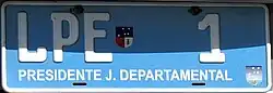 - JD (Junta Departamental; characters and blue border with white background, or characters and white border with dark red background; only with the legend "J. Departamental". It presents from 1 to three numbers and the departmental icons according to the Intendancy (generally the departmental coat of arms in the center))