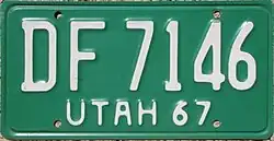 | 1967 | White on green; "UTAH 67" at bottom | none | AB 1234 | AA 1000 to approximately FD 5000 |
