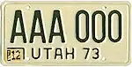 1973 | Black on reflective white; "UTAH 73" at bottom | none | ABC 123 | AAA 001 to approximately HDH 999 | Three-letter series used a split-alphabet system, with each letter advancing A, B, C, D, E, F, H, J, K (block 1), or L, M, N, P, R, S, T, V, W (block 2). Progression was as follows: all three letters in block 1, then first letter in block 2 and last two letters in block 1, then first two letters in block 2 and last letter in block 1, then all three letters in block 2, and finally first two letters in block 1 and last letter in block 2. On the 1974–78 variant, two different designs of beehive were used - one rounded, the other pointed. All variants are still currently revalidated. |