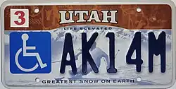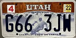 | Slogan | Ski and arch plates: Life Elevated Ski plate only: Greatest Snow on Earth In God We Trust plate: In God We Trust; United We Stand |