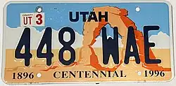 | 1992–96 | Dark blue on Delicate Arch graphic; "UTAH" in white | Centennial | 123 ABC | 001 ZAA to 999 ZEZ | Commemorated Utah's 100 years of statehood. Issued concurrently with the 1985 Ski base, first as an extra-fee base and then as a no-cost base from 1997. The first letter in the serial progressed backwards (so 999 ZZZ was followed by 001 YAA, 999 YZZ was followed by 001 XAA, and so on).