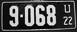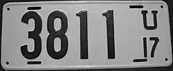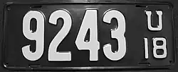 1919 | White on dark olive green; "U 19" at right | none | 12345 | 5000 to approximately 34600 | Serials 1 through 399 used on dealer plates, and 400 through 4999 on truck plates.[4] |
