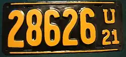 1921 | Orange on black; lines at top and bottom borders; "U 21" at right | none | 12345 | 7001 to approximately 47500 | Serials 1 through 400 used on dealer plates, and 401 through 7000 on truck plates. |