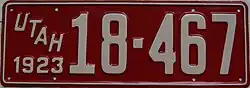 1923 | White on red with border line; slanted "UTAH" and "1923" at left | none | 12-345 | 8-501 to approximately 65-000 | First use of the full state name. Secretary of State, dealer, truck and trailer plate serials same as 1922. |
