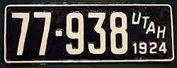 1924 | White on dark blue with border line; slanted "UTAH" and "1924" at right | none | 12-345 | 10-000 to approximately 79-000 | Serial 1 issued to Secretary of State; 2 through 299 used on dealer plates, 300 through 499 on trailer plates, 500 through 999 on exempt plates, and 1-000 through 9-999 on truck plates. |