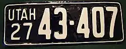1927 | White on dark blue with border line; "UTAH 27" at left | none | 12-345 | 1-500 to approximately 82-000 | |