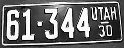 1930 | White on black with border line; "UTAH 30" at right | none | 12-345 | 1-500 to approximately 93-500 | |