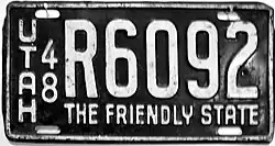 1948 | White on black with border line; vertical "UTAH" and "48" at left | THE FRIENDLY STATE | A1234 | ||