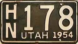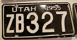 In 1956, the United States, Canada, and Mexico came to an agreement with the American Association of Motor Vehicle Administrators, the Automobile Manufacturers Association and the National Safety Council that standardized the size for license plates for vehicles (except those for motorcycles) at 6 inches (15 cm) in height by 12 inches (30 cm) in width, with standardized mounting holes.[3] The 1954 (dated 1955) issue was the first Utah license plate that complied with these standards.