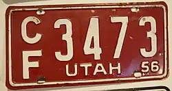 1956 | White on dark red with border line; "UTAH 56" at bottom right | none | A/B 1234 | A/A 1000 to approximately D/J 9999 | For each two-letter series, only the letters A, B, C, D, E, F, H, J and K were used. This practice continued until 1970. |