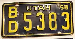 1958 | Yellow on dark blue with border line; "UTAH 58" at top right | none | A/B 1234 | A/A 1000 to approximately D/H 9999 | |