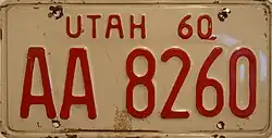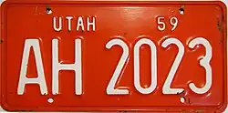 1959 | White on red-orange; "UTAH 59" at top | none | AB 1234 | AA 1000 to approximately DK 5000 | |