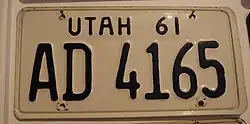 1961 | Dark blue on off white; "UTAH 61" at top | none | AB 1234 | AA 1000 to approximately EC 5000 | |