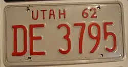 1962 | Red on off gray/white; "UTAH 62" at top | none | AB 1234 | AA 1000 to approximately EE 5000 | |