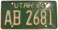 1964 | White on green; "UTAH 64" at top | none | AB 1234 | AA 1000 to approximately EJ 9999 | |