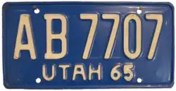 1965 | White on blue; "UTAH 65" at bottom | none | AB 1234 | AA 1000 to approximately FA 9999 | |