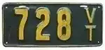 1918 | Embossed golden yellow serial on green plate with border line; vertical "VT" at right | none | 12345 | 1 to approximately 22500 | |