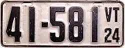 1924 | Embossed black serial on silver plate with border line; "VT 24" at right | none | 12-345 | 100 to approximately 57-000 | |