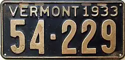 1933 | Embossed white serial on dark blue plate with border line; "VERMONT 1933" at top | none | 12-345 | 101 to approximately 69-000 | |