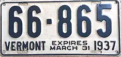 1936–37 | Embossed dark blue serial on white plate with border line; "VERMONT EXPIRES MARCH 31 1937" at bottom | none | 12-345 | 1 to approximately 77-000 | |