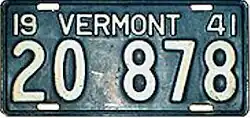 1941 | Embossed white serial on dark blue plate; "19 VERMONT 41" at top | none | 12 345 | 1 to approximately 87 000 | |