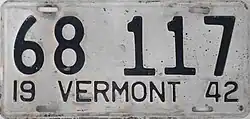 1942–43 | Embossed dark blue serial on white plate; "19 VERMONT 42" at bottom | none | 12 345 | 1 to approximately 88 000 | Revalidated for 1943 with yellow tabs, due to metal conservation for World War II. |