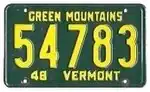 1948 | Embossed gold serial on dark green plate; "48 VERMONT" centered at bottom | "GREEN MOUNTAINS" centered at top | 12345 | 1 to approximately 96000 | Most recent passenger base to use a color other than green or white. |