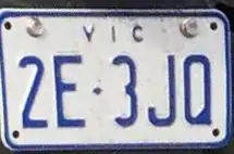 From January 1953, owing to the Federal number plate system, Victorian plates switched to the three-letter, three-number standard: GAA-000 to HZZ-999, and JAA-000 to LZZ-999, coloured white lettering on a black background, and a "Vic" insert on the top of the plate.[4] The first three-lettered plate, GAA-000 was issued on 27 January 1953.[5] The letters "I" and "Q" were not issued in any combinations, due to these being easily mistaken for "1" and "O" or "0". For the same reason, In 1964, Victoria skipped the I-prefix series and went straight from HZZ-999 to JAA-000. However, having reached the end of their Federal allotment of letters, Victoria in 1974 commenced from LZZ-999 to IAA-000 (in some later plate sequences, the capital I had noticeable staves to tell them apart from the number 1. The earlier sequences did not, due to the I-series plates being made by two different manufacturers, who used different dies for the "I"). This was only a temporary measure, naturally, as Victoria faced the same problem having proceeded through the I-series three years later.