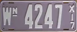 1916–17 | Embossed white serial on lavender plate with border line; "WN" at left and vertical "X17" at right | none | 12345 | 1 to approximately 64000, with gaps | The 'X' indicated the passenger class of vehicles; other letters were used for other classes.[4] |