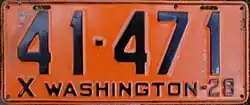 1928 | Embossed black serial on orange plate with border line; "X WASHINGTON-28" at bottom | none | 123-456 | 1 to approximately 343-000 | |