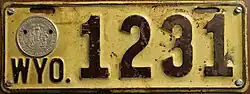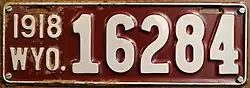 1918 | Embossed white serial on brown plate with border line; "1918 WYO." at left | 12345 | 1 to approximately 18000 | First dated plate. |