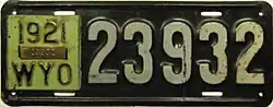 1920–21 | Embossed white serial on dark green plate; "1920 WYO" at left | 12345 | 1 to approximately 30000 | Revalidated for 1921 with light green tabs. |