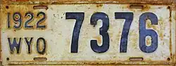 1922 | Embossed navy blue serial on cream plate; "1922 WYO" at left | 12345 | 1 to approximately 28000 | |