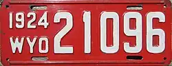 1924 | Embossed white serial on red plate; "1924 WYO" at left | 12345 | 1 to approximately 39000 | |