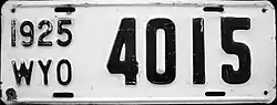 1925 | Embossed black serial on white plate; "1925 WYO" at left | 12345 | 1 to approximately 45000 | |