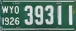 1926 | Embossed white serial on green plate; white lines at top and bottom borders; "WYO 1926" at left | 12345 | 1 to approximately 45000 | |