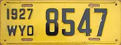 1927 | Embossed black serial on yellow plate; "1927 WYO" at left | 12345 | 1 to approximately 47000 | |