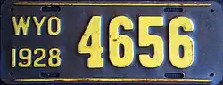 1928 | Embossed yellow serial on navy blue plate; yellow lines at top and bottom borders; "WYO 1928" at left | 12345 | 1 to approximately 49000 | |