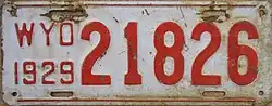1929 | Embossed red serial on white plate; red lines at top and bottom borders; "WYO 1929" at left | 12345 | 1 to approximately 52000 | |