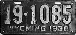 1930 | Embossed white serial on black plate; white lines at top and bottom borders; "WYOMING 1930" at bottom | 1-1234 10-1234 |