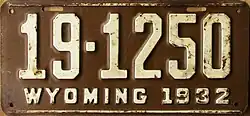 1932 | Embossed cream serial on brown plate; cream lines at top and bottom borders; "WYOMING 1932" at bottom | 1-1234 10-1234 |