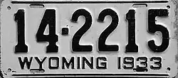 1933 | Embossed black serial on white plate; black lines at top and bottom borders; "WYOMING 1933" at bottom | 1-1234 10-1234 |