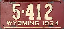 1934 | Embossed white serial on dark red plate; white lines at top and bottom borders; "WYOMING 1934" at bottom | 1-1234 10-1234 |