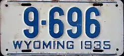 1935 | Embossed blue serial on white plate; blue lines at top and bottom borders; "WYOMING 1935" at bottom | 1-1234 10-1234 |