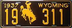 1937 | Embossed yellow serial and Bucking Horse and Rider on brown plate with border line; "1937 WYOMING" at top | 1-1234 10-1234 |