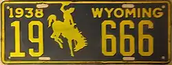 1938 | Embossed yellow serial and Bucking Horse and Rider on navy blue plate with border line; "1938 WYOMING" at top | 1-1234 10-1234 |