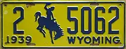 1939 | Embossed navy blue serial and Bucking Horse and Rider on golden yellow plate with border line; "1939 WYOMING" at bottom | 1-1234 10-1234 |