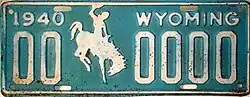 1940 | Embossed white serial and Bucking Horse and Rider on turquoise plate with border line; "1940 WYOMING" at top | 1-1234 10-1234 |
