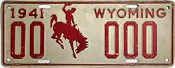 1941 | Embossed red serial and Bucking Horse and Rider on white plate with border line; "1941 WYOMING" at top | 1-1234 2-A123 10-1234 |