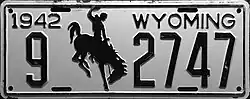 1942 | Embossed black serial and Bucking Horse and Rider on white plate with border line; "1942 WYOMING" at top | 1-1234 2-A123 10-1234 |